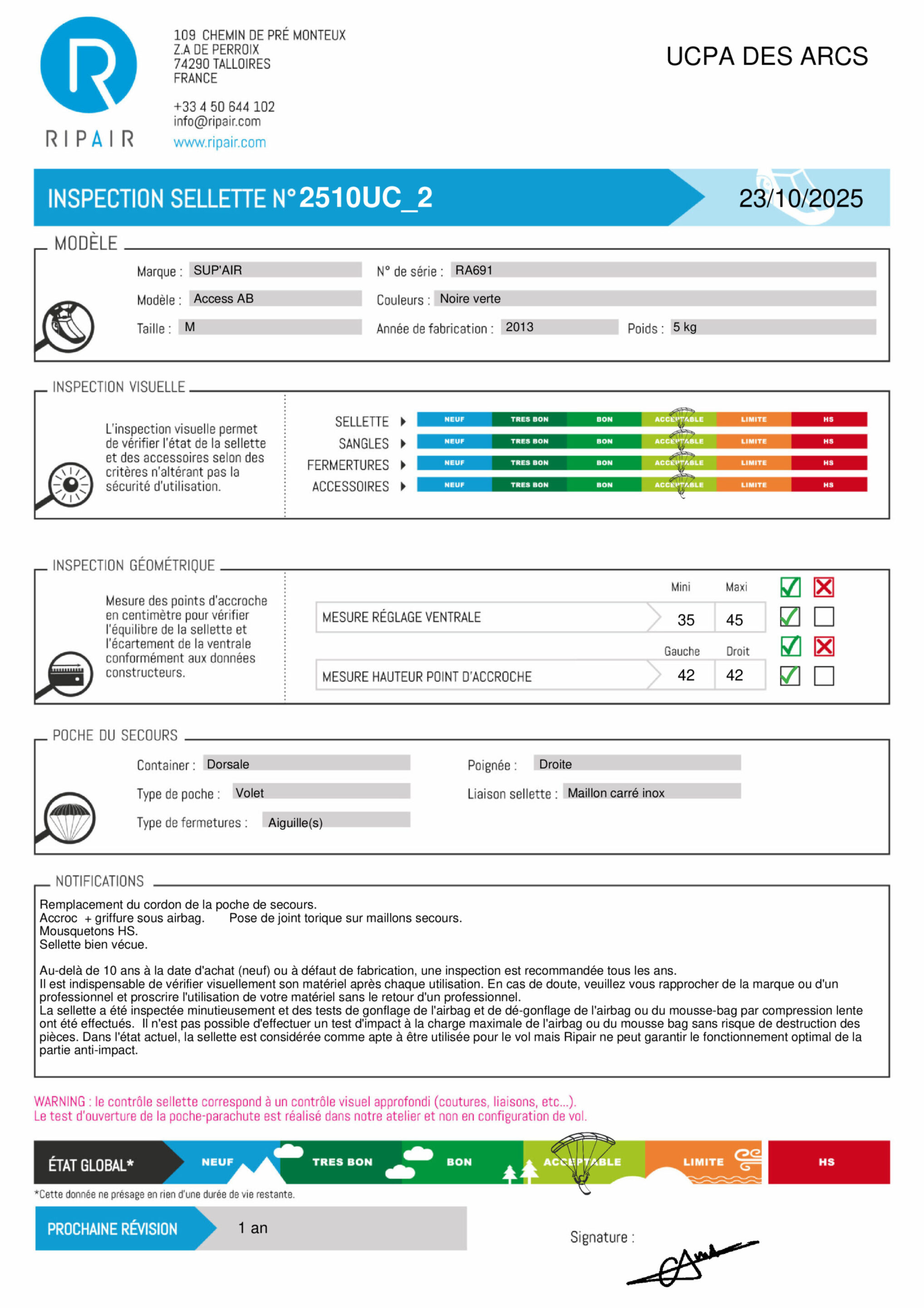 RIPAIR certifie le bon état de la sellette, son aptitude au vol et un tarif juste. Les frais d'envoi ne sont pas compris.