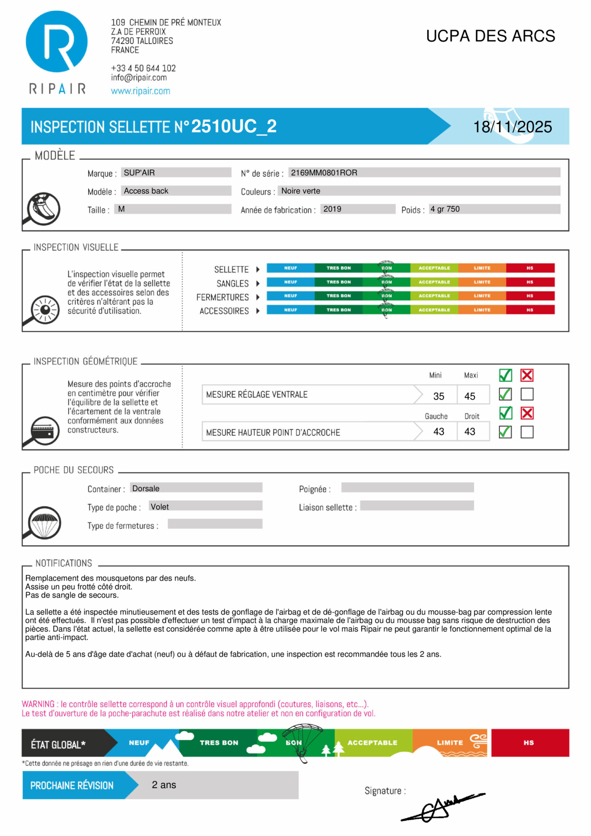 RIPAIR certifie le bon état de la sellette, son aptitude au vol et un tarif juste. Les frais d'envoi ne sont pas compris.