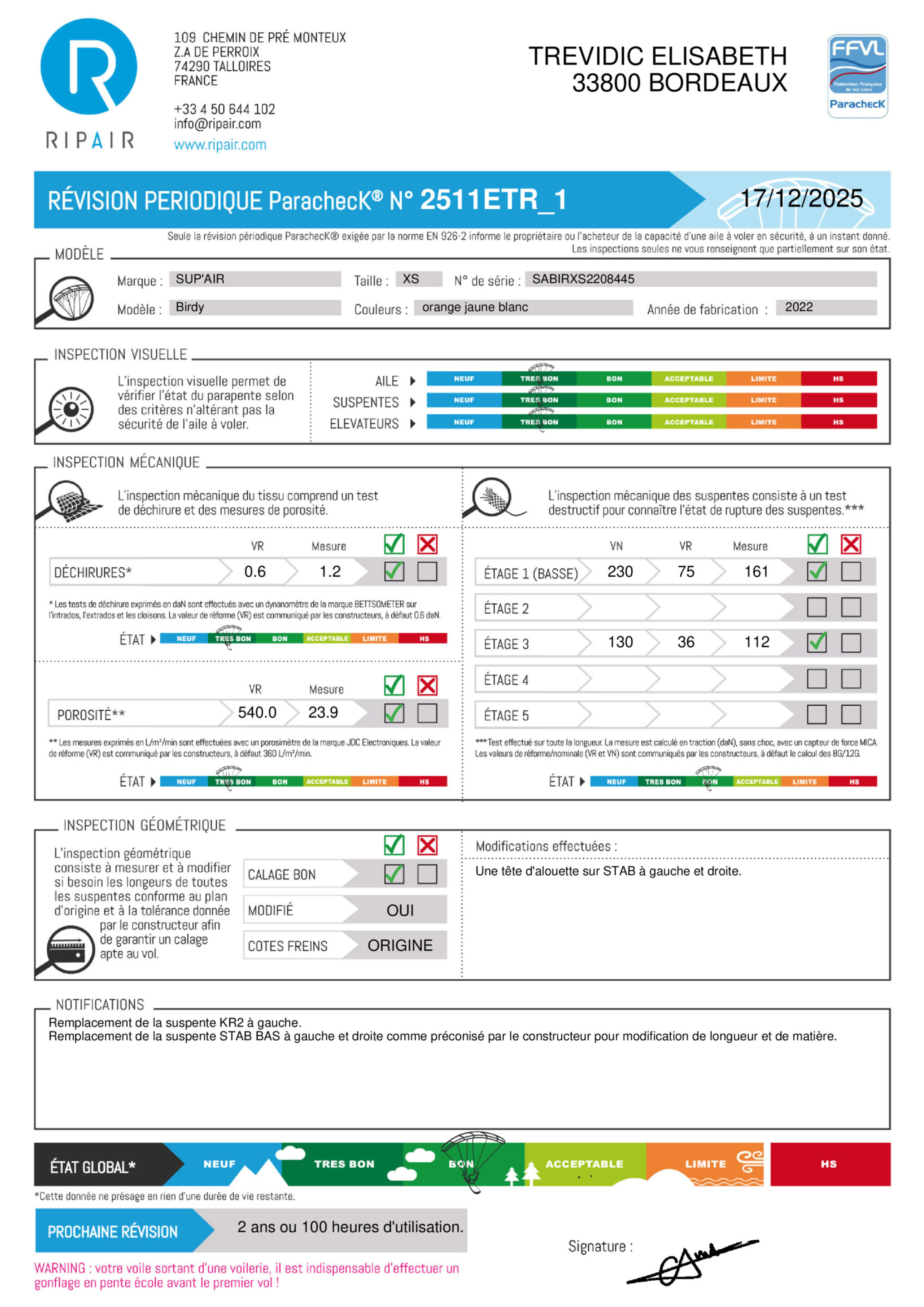 Une révision périodique PARACHECK© a été effectuée, ce qui signifie que la totalité de l'aile a été contrôlée.