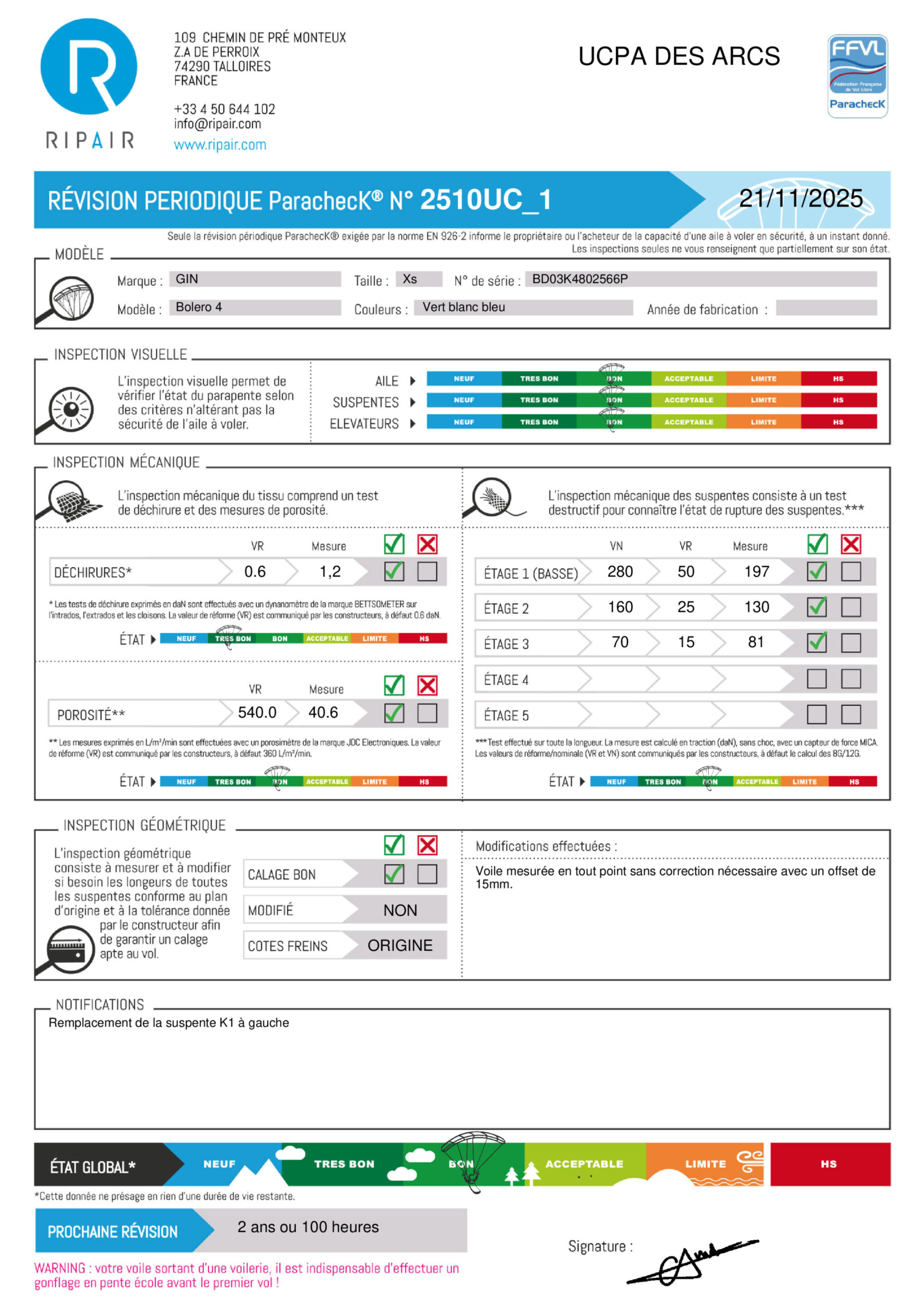 Une révision périodique PARACHECK© a été effectuée, ce qui signifie que la totalité de l'aile a été contrôlée.