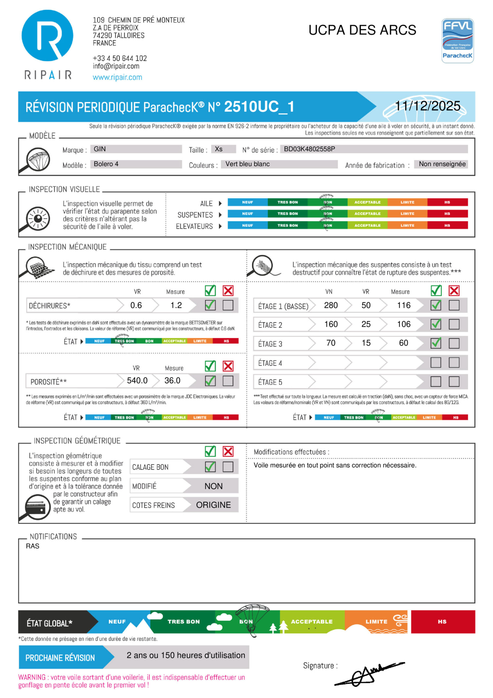 Une révision périodique PARACHECK© a été effectuée, ce qui signifie que la totalité de l'aile a été contrôlée.