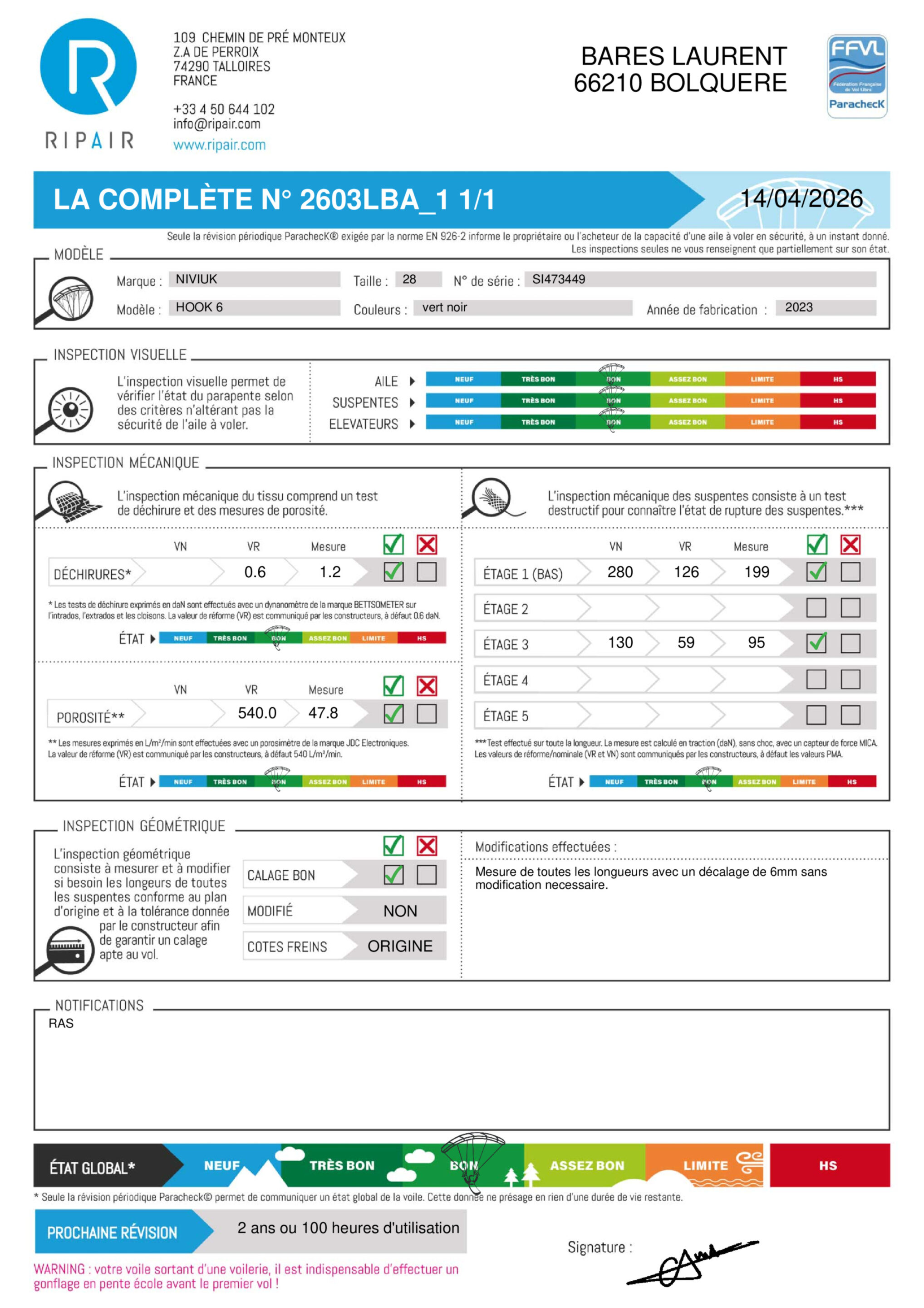 Une révision périodique PARACHECK© a été effectuée, ce qui signifie que la totalité de l'aile a été contrôlée.