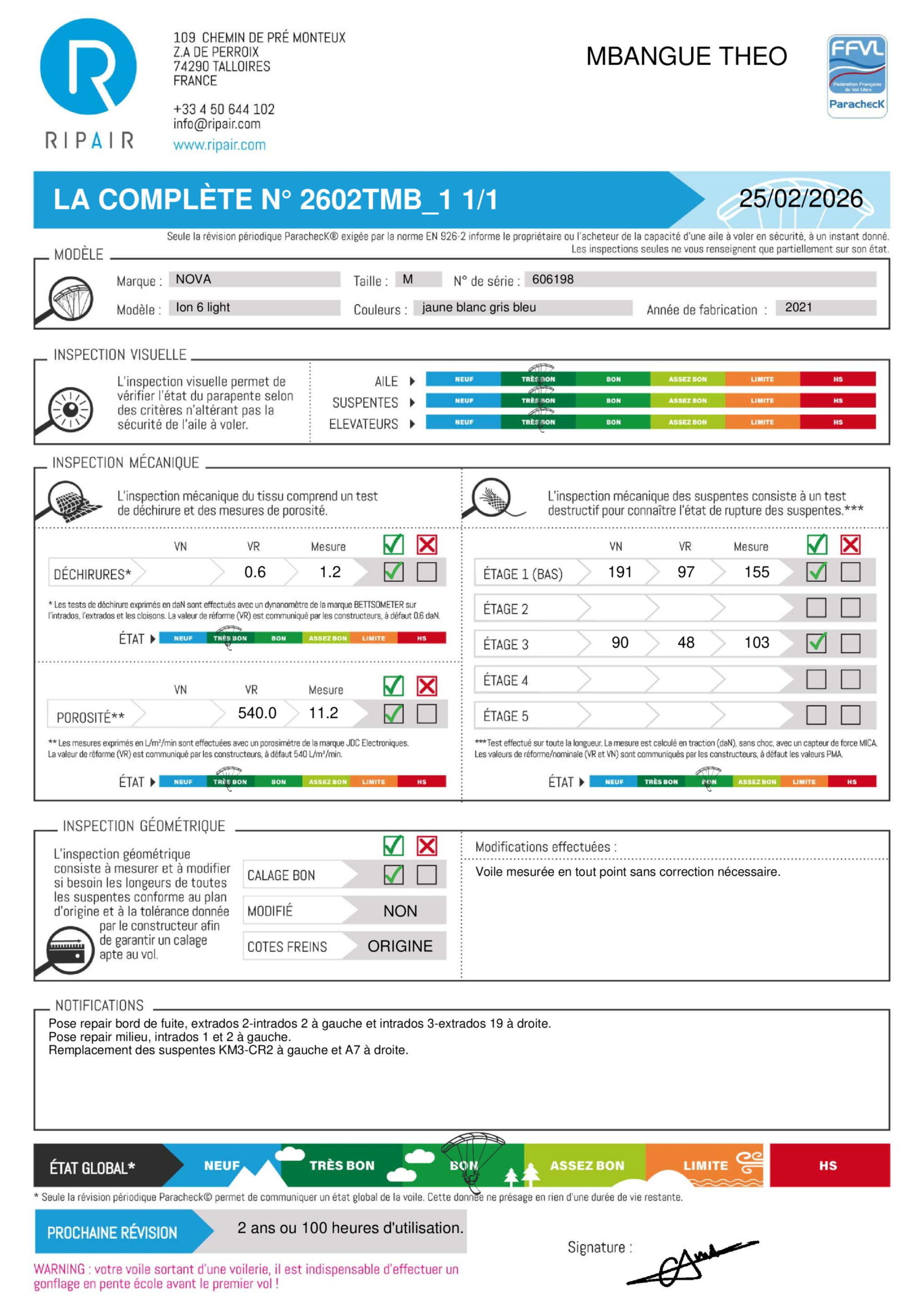 Une révision périodique PARACHECK© a été effectuée, ce qui signifie que la totalité de l'aile a été contrôlée.
