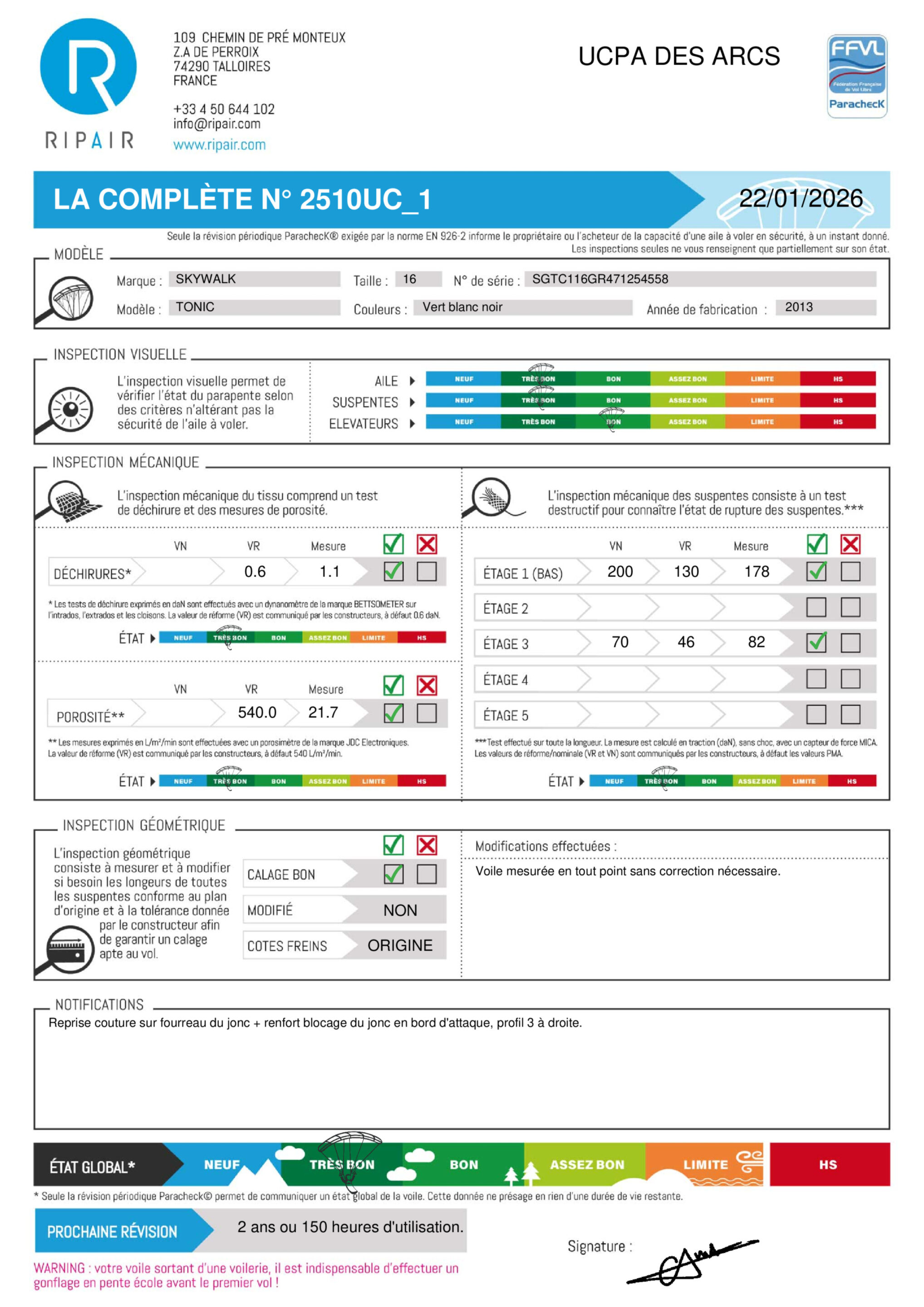Une révision périodique PARACHECK© a été effectuée, ce qui signifie que la totalité de l'aile a été contrôlée.