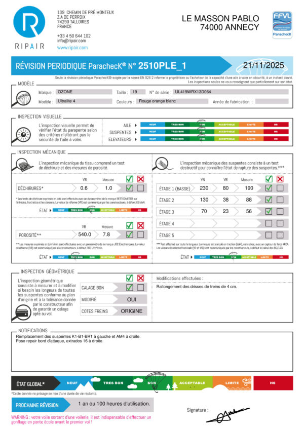Une révision périodique PARACHECK© a été effectuée, ce qui signifie que la totalité de l'aile a été contrôlée.