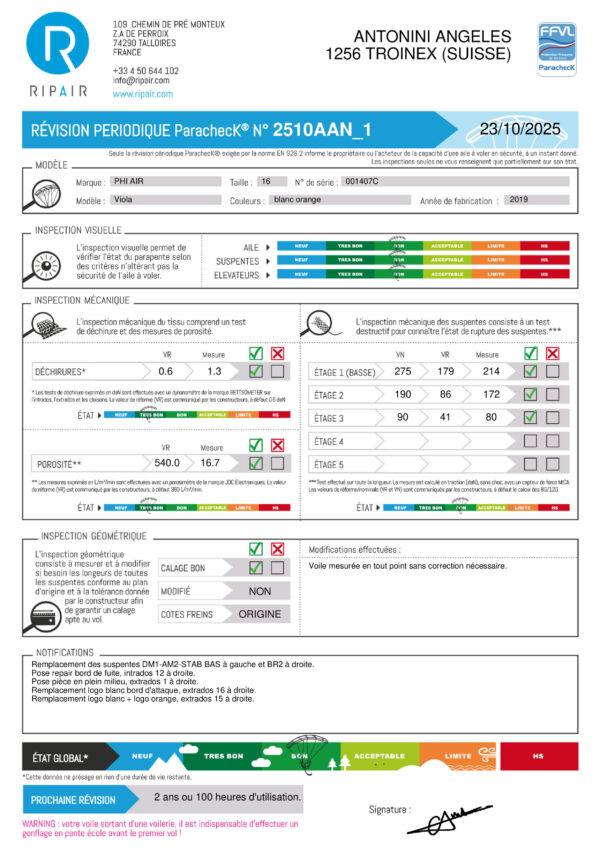 Une révision périodique PARACHECK© a été effectuée, ce qui signifie que la totalité de l'aile a été contrôlée.
